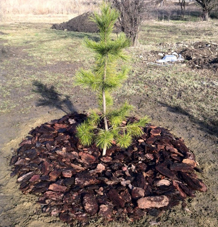 Саженец плотно заворачивается в гофрокартон. Это позволяет избежать появления повреждений ствола и обломанных веток. К высоким саженцам крепится штатив из дерева.