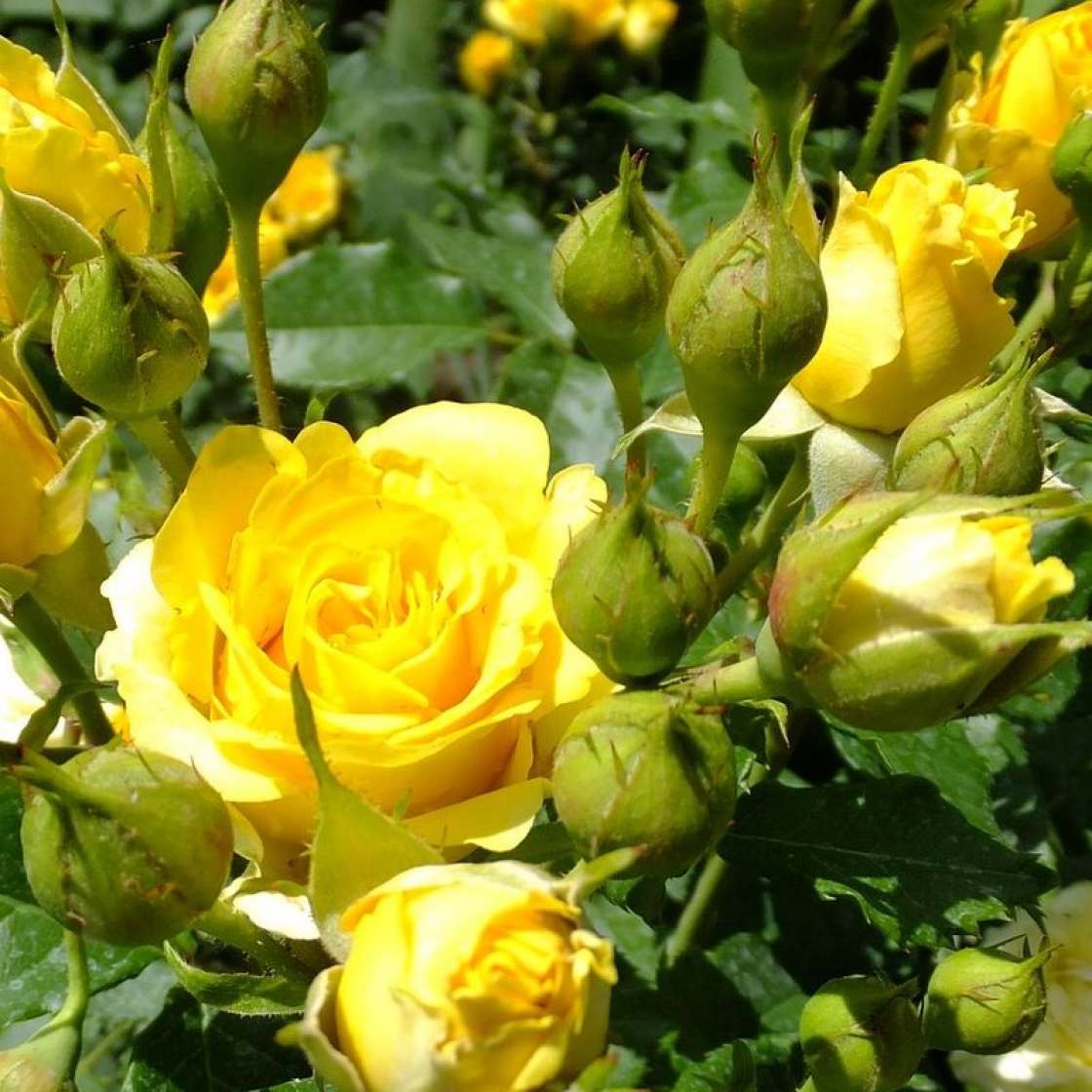 Роза Sun City (Сан Сити) – это одна из самых привлекательных и универсальных роз, подходящая для выращивания как в горшках, так и в открытом грунте. Она может быть использована как флорибунда или полиантовая роза. Кусты лимонного цвета выглядят элегантно и привлекают внимание своей яркостью. Особенность этого сорта – практически непрерывное цветение. Небольшие ярко-желтые цветки сменяют друг друга на протяжении всего лета и осени. Цветки размером 5-6 см распускаются пышными кистями по 5-10 роз на одной ветке. Лепестки слегка волнистые, распускаются из ярко-желтого бутона в аккуратный чашевидный цветок и постепенно светлеют. В жаркую погоду цвет лепестков может выгорать до бледно-желтого. Первое цветение куста особенно впечатляет своей пышностью и яркостью, а отцветающие розочки незаметно заменяются новыми бутонами. Аромат у розы тонкий, едва уловимый, с нотками фруктов.