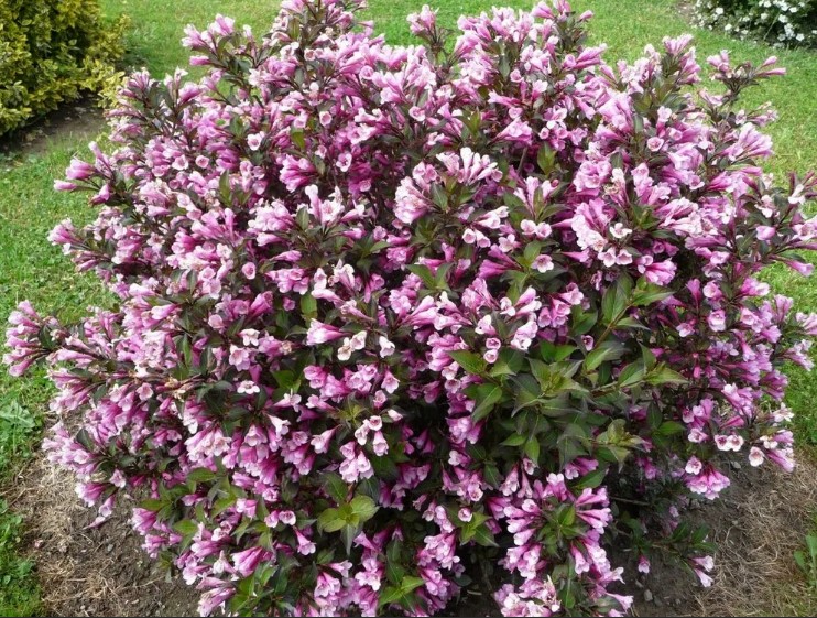 Вейгела Нана Пурпуреа – это компактный декоративный кустарник, который вырастает до 1 метра в высоту, хотя некоторые сорта могут быть и выше. Листва этого растения ярко-зеленая, но у некоторых разновидностей может быть коричневая или красноватая окраска. Крупные трубчатые цветки собраны в соцветия и радуют разнообразием оттенков.